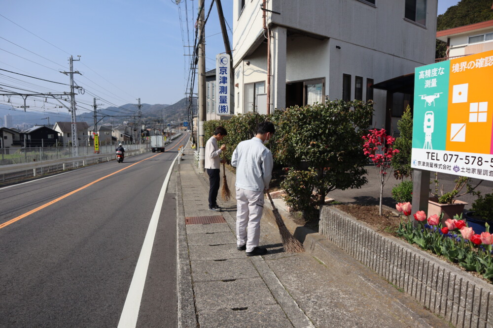 令和8年4月3日、京津測量株式会社では、地域社会への貢献を目的としたCSR活動の一環として、会社周辺および駐車場付近の清掃活動を実施いたしました。